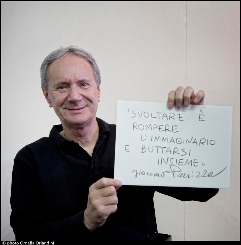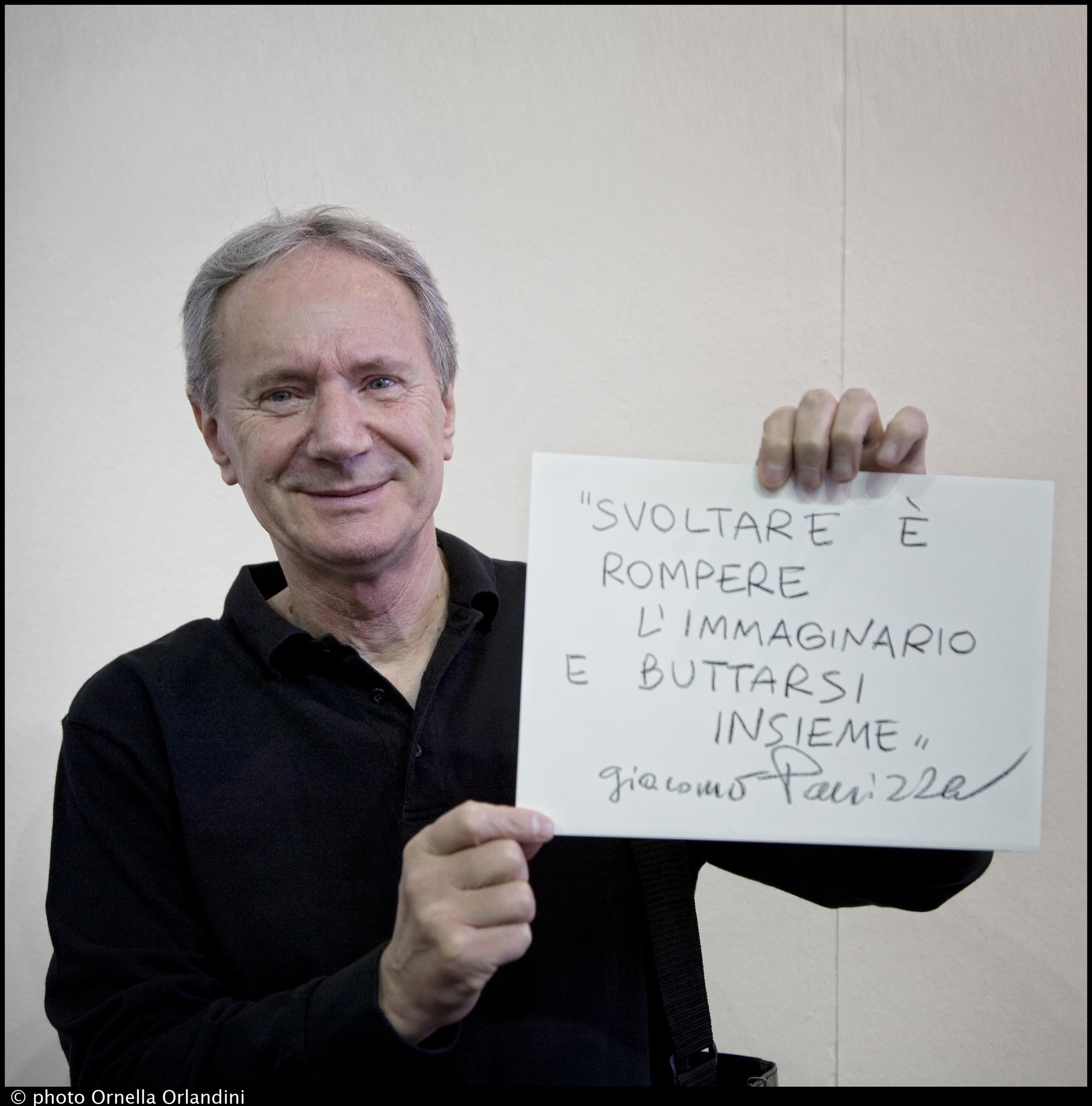 Torino, maggio 2011. Sulla scia delle parole del futuro di Andrea Bajani, in collaborzione con in Salone del libro e il bookstock village, Ornella Orlandini presenta il progetto di immagini e parole SMS in Bottiglia. Un ritratto agli ospiti e un sms sulle parole del futuro a memoria del presente. Nella foto don Giacomo Panizza. Parola: svolta